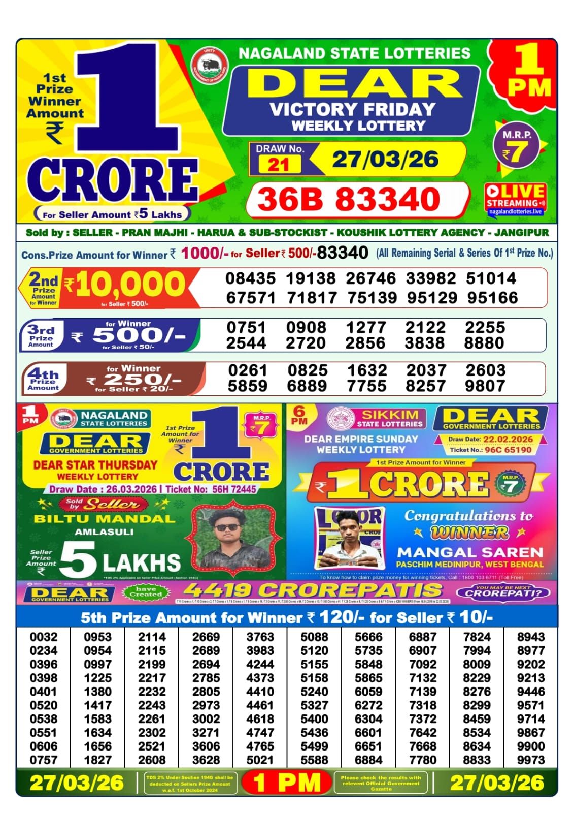 - 1 PM: Dear Victory Friday Weekly Lottery Result For 27/03/26