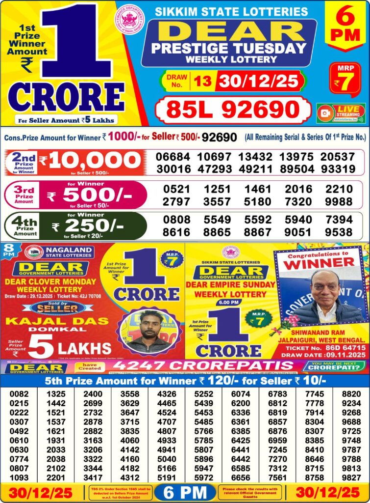 - 6 PM: Dear Prestige Tuesday Weekly Lottery Result For 30/12/25